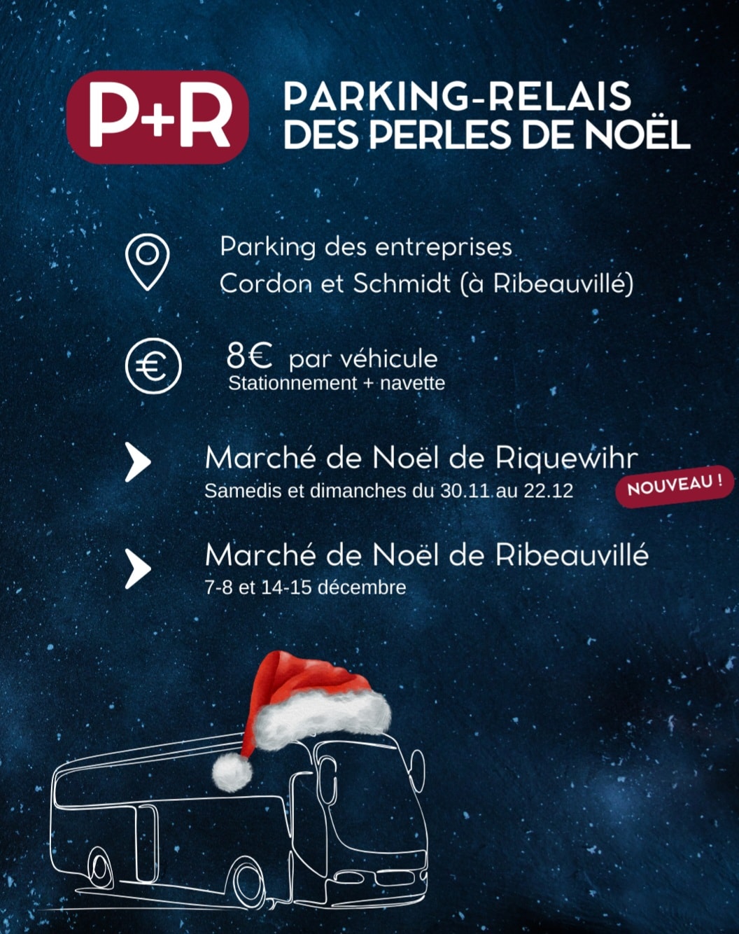 Dès le 30 novembre, le parking-relais des Perles de Noël vous permet de rejoindre en toute simplicité les marchés de Noël de Riquewihr et Ribeauvillé.